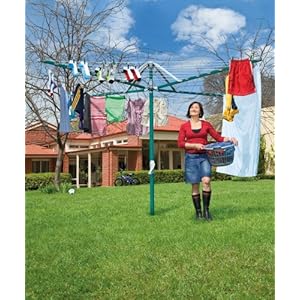 Welcome to the wonderful line of Hills Brand eco-friendly clotheslines. Hills is known internationally for quality and durability, and their clotheslines are now readily available here in America. The Rotary 7 (formerly the Rotary 450) is our "large" rotary (Hoist) in Forest Glade Green . Once the arms are opened and latched, your wash can be hung...then turn the crank to raise the lines up an additional 16 inches. Once fully raised the Rotary 7 will catch the breeze and spin in the wind while gently drying your laundry. The finely engineered lines are individually strung so there is no fear of a line breaking and having to restring the entire rotary. This fabulous folding line hoist holds a large size family's wash with a total line length of 154.2ft (47 m). Diameter of Rotary Post is 2.25 in and requires 15ft (4.6m) diameter of yard space; outermost line is 8ft (2.4m) in length. The Rotary 7 comes with a ground socket that is easily set into the ground with gravel and cement. A set of spacers to raise the height of your rotary, if needed. A ground socket cap to be used if you remove the rotary and complete instructions. Line drying reduces your energy costs and extends the life of your clothing. "Line dry and save our sky!"