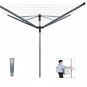 This Outdoor Rotary Lift-O-Matic Advanced Umbrella Clothes Dryer Clothesline 164ft - Brabantia #314506 is another top-quality lift-o-matic but with a twist; an Ultra-light 'easy-lift' system that makes the adjustable head even easier to raise and lower. And it has beefier arms for even your heaviest items. This dryer is seamlessly adjustable to your ideal working height, from 4.5 to 6 feet high. Better yet, at its lowest position, you can easily lay cushions and linens over the top for airing. Constructed with an anodized aluminum center post and Galfan-coated (top-of-the-line for corrosion resistance) steel arms that effortlessly rotate. With 196 feet of line, this laundry airier holds 3-4 loads of washing, enough for your average family. It also includes a metal ground sleeve that you cement. Therefore you can remove the dryer whenever you want. Its umbrella-style design is a cinch to fold down and store in the included protective cover. The poly-core clothesline is strong and can easily be re-tensioned.This Lift-O-Matic is made in the Netherlands and is a perfect rotary airier for those of you who want to move up from the economy, China-made units to a quality airier with a 5-year warranty.Brabantia's Tag-Line is 'Get Inspired' and their stylish, timeless designs certainly make us inspired. Your home should be comfortable to live by surrounding yourself with things of beauty, functionality and durability - all of which perfectly describe Brabantia's products. And what's more, each item is made to be enjoyed every day, even after years of intensive use. Many items are made in the Netherlands or Belgium and all carry one of the most generous warranty periods in the industry. So spend a little more and get the quality you deserve! Yes, Get Inspired!Size: 196Ft; Post 2.25In; Height Adjusts: 50 - 70 Inches -- Color: Steel